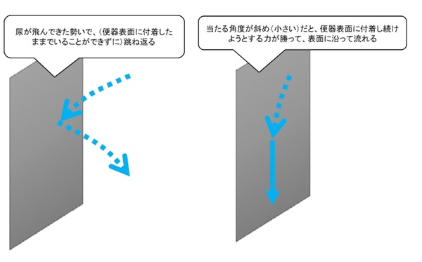 もちろん、尿が跳ね返らないこともあります。それは、尿には便器表面に付着しようとする力も働くので、たとえば尿が便器に向かって斜めにぶつかってきた場合などは、その力によって「尿は便器表面に沿った方向に流れていく」ようになるからです。