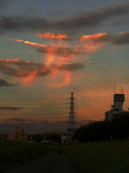 湿気て暑い夕暮れ時、「シッポを垂らした雲」たちが空に浮かんでいました。日没を過ぎて、地平線の無効から夕日が雲の尻尾を赤く照らしています。