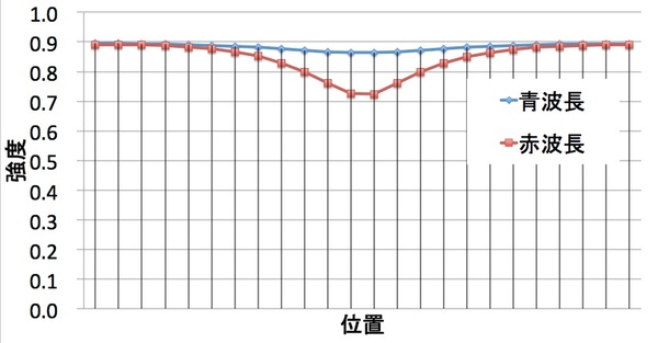 さらに青色・赤色波長の「(光が散乱して方向を変えるまでの)平均自由行程」を踏まえて、表面での光強度分布の違いを描いてみると、限りなく大雑把な近似に基づいた計算をすると、下図のような感じです(縦軸はその波長における周辺近傍の平均強度を基準にした相対値です) 。