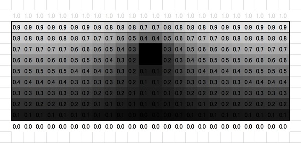 …というわけで、ラプラス方程式を離散化して、お手軽なエクセルで「皮膚内部に血管がある時の、その周辺の皮膚内部・表面での光強度分布を(たとえば青色波長で)可視化してみたのが下図になります。エクセルの各セルは離散化された空間上の各領域を示していて、そこに示されている色と値が光強度を示しています。