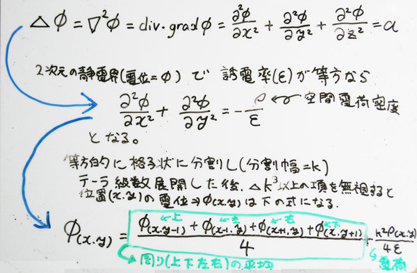 まず、静電場を記述するポワソン方程式をテーラ級数展開することで離散化し、差分方程式に変えてみます。2次元世界を離散化するということは、エクセルの表がそうであるように「世界(画面)をセルで分割する」ということです。