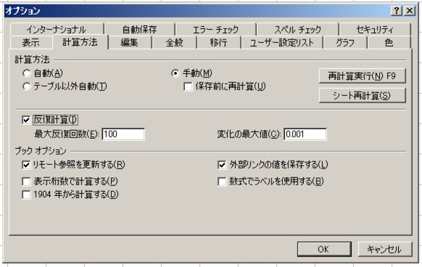 こういったセルの値が「(そのセル自身を含む)セル間の関係式」で表わされるような計算式を解くためには、エクセルの設定で「反復計算を行う」という設定を有効にしておく必要があります。エクセルのバージョンによってその設定メニュー場所は違いますが、たとえば、下の画面はExcel 2003の設定ダイアログの例です。