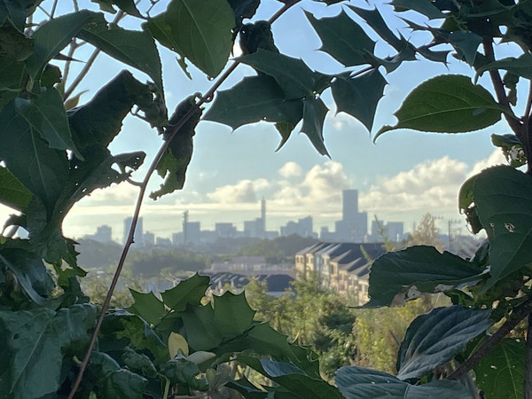あるいは、路地を少し歩くだけで、反対側の住宅地の向こうに東京都心の高層ビル街が見えてきたりもするのです。今年、オリンピックがあるはずだった2020年のTOKYOが、少し寂しい色合いにも見えたりして、そんな景色を見ることができるのも、市街地アルプス山歩きの楽しい利点のひとつです。