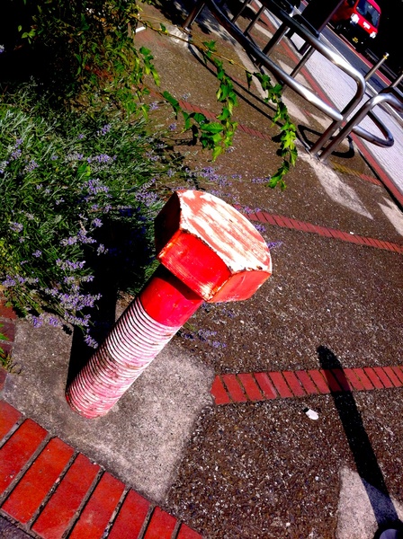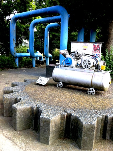 今日眺めた「理系の散歩道」は新横浜駅近くにある「新田緑道」です。暑い日差しを心地良く緑(みどり)が遮(さえぎ)る小道には、懐かしくも力強い機械や部品が詰まっていました。足下にギアやチェーン形状が埋め込まれているかと思えば(右写真に見える”ギア”は道路に埋め込まれた”ギア”なのです)、ふと座り込んだベンチもチェーンの形をしていたりします。そして、道の端を彩るのはプーリーやネジで、ところどころにボール盤やバープレスなどが置かれていたのです。