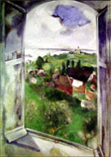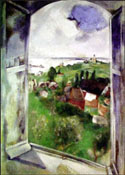 この「散歩、日傘をさす女」は単に紙で作ったニセモノのパノラマの景色みたいに見える、という人がいるかもしれないので、次にシャガールの「窓」も同じように眺めてみよう。まずは、オリジナルの「窓」である。