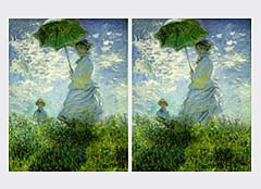 ところで、「過去を見る右目と、未来を見る左目と」の時の話のように、「異なる場所から撮った二枚の画像」だけが立体画像になるわけではない。「異なる時間から眺めた二枚の画像」だって、立派な立体画像になる。時間の流れの中で何かが変化すれば、左右の目で視差を生じて、私達の目は立体感を感じるのである。ということは、例えば下のように『日傘をさす女』を二枚並べて、右目で右の絵を左目で左の絵をそれぞれ眺めた時には、私達はやはり何らかの立体感覚を感じるのではないだろうか?