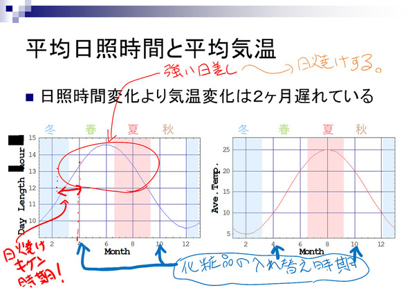 ところで、上の図を見ればわかるように、平均日照時間の変化から平均気温は約2か月ほど遅れて変化していきます。また、日焼けは紫外線量=日照時間量に比例すると考えるのが自然ですから、日焼け対策は「日照時間量が長くなり始める春分(三月中旬)を過ぎた頃」から始めるのが(本来であれば)適当に思われます。