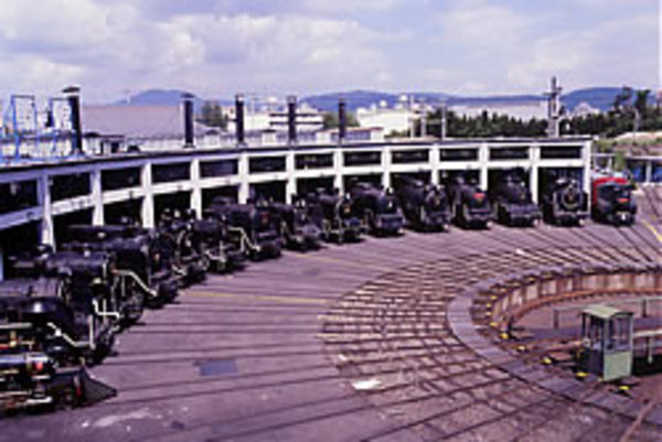 かつては、蒸気機関車が車庫に前進で入った場合でも、バックしつつ車庫に入った場合でも排煙することができるように、煙突は前後2箇所に取り付けられていたと言います。今では動くことがなくなった機関車が佇む車庫の、機関車の上に備え付けられた煙突は(安全上の理由などから)ずいぶん数が減っているといいます。