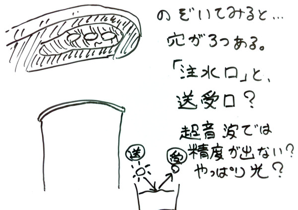 もちろん、その穴の内のひとつは、注水口に違いありません。ということは、残り2つで水の量を計測しているのだろう、ということになります。ふたつの穴ということは、片方は”何かを出す”穴で、もう片方が”何かを受ける穴”という具合に思えます。