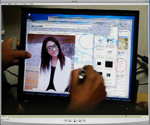 仕事打ち合わせの時は、大型のホワイトボードに液晶プロジェクターでPCの画面を投影し、必要に応じてホワイトボード(つまりPCの画面)にホワイトボード用のペンで書き込み(説明文や説明用の図)を書き入れていくことが多いです。そして、その画面に関して話し終わったら、デジタルカメラでそのホワイトボード画面(PC画面+ペンによる書き込み)を撮影して、次の話題にうつるわけです。時には、プラズマ・ディスプレイを使った説明などでも、そんな画面への(ホワイトボード用のペンを使った)書き込みをして、周りを驚かせてしまうことがあります。