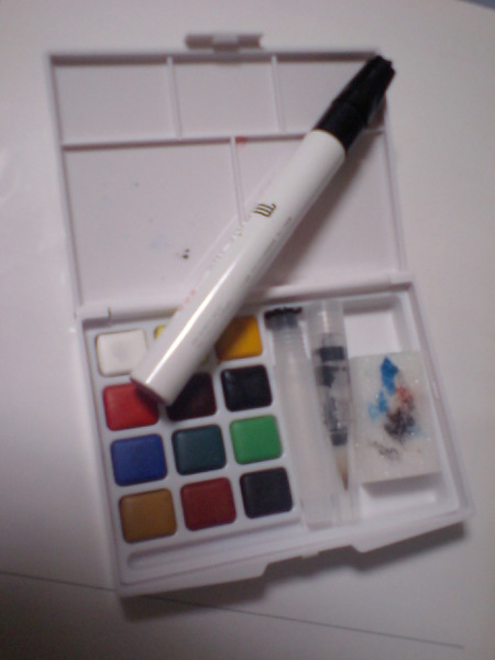 文房具屋で「DSサイズの水彩画セット」を見つけ、思わず買ってしまった。実際には、任天堂のDSよりもっと小さくて、ずっと昔に流行った「ゲームウォッチ」とほぼ同じサイズの、筆記用具入れの中に、さらにケースごと入ってしまうほどに小さな「水彩画セット」だ。