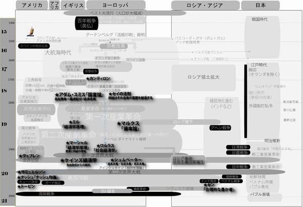 『理系サラリーマン 専門家11人に「経済学」を聞く!』で、経済学者の先生方に話を聞く中で、よく歴史を辿りながら話を聞いたように思います。「株式会社」の歴史、「消費」の歴史、「社会」の発展の歴史……色んな歴史を描き辿りました。そこで、単行本を作る時に、世界の社会背景変化や技術発展や文化の歴史などを、自分なりの歴史年表を描きながら眺めなおし、そして、講義の中で聞いた話や経済学者や事件などをその歴史に重ねつつ、読み直してみたのです。その年表を綺麗にしたものが、単行本の末尾にオマケで付けたものです。
