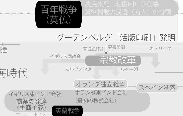 たとえば、グーテンベルグが活版印刷を「発明」し、聖書が印刷され、プロテスタント系の人たちが印刷機で宣伝ビラを大量に作り、そして、宗教革命が起きていく。そんな歴史の中では、経済活動も科学技術も絵画などの文化も、どれも密接に繋がっていたんだなぁ、などと色んな事象の因果関係をとても自然に納得することができました。
