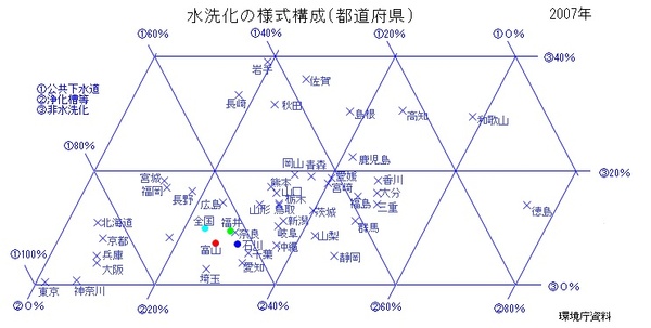 人口密度が高いと下水普及率は高いのだなぁ…と思いつつ、似たようなグラフを眺めていくと、トイレに排泄したものをどう処理するかを、