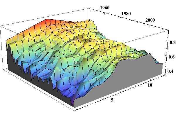 1940年代から2012年までの、東京の季節折々の最高気温と湿度を眺めてみました。すると、最高気温はたいして変化がないけれど(下左グラフ:各軸はZ軸が気温(℃)で、XY軸が「年」と「月」です)、湿度は大きく変化していることがわかります(下右グラフ:各軸はZ軸が湿度(パーセント/100)で、XY軸が「年」と「月」です)。かつての東京は、夏前には湿度が70パーセント程度の蒸した気候だったのに、それが今では湿度の低い乾燥した気候になっていることがわかります。