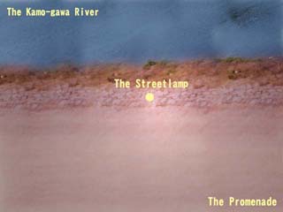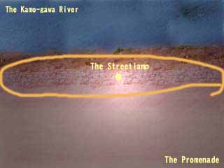 ![]() | 鴨川の川縁を真上から見た所。画面上部が鴨川。画面下部が歩道。画面中央に街灯がある。そのため、画面中央が一番明るい。 |