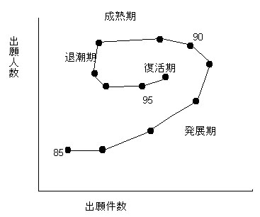 例えば、「X軸に出願件数、Y軸に出願人数をとり、各年の総出願人数と総出願件数の示す点の推移を追うことにより、各技術が発展期にあるのか、成熟期、退潮期、復活期にあるのかを分析でき、かつ今後の動きを予測できる」という件数推移マップなんて面白いと思う。