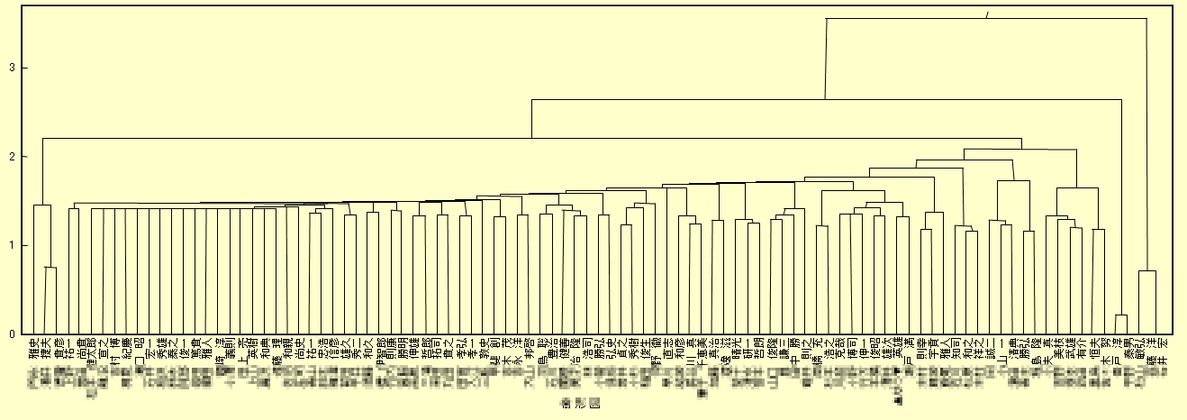 ちなみに、同様なことをR社に対して行って、「職場の男女関係」を明らかにしようとしたこともあります(上の樹形図はその解析過程で得られた図の一例です)。「どの男性」と「どの女性」が近い関係にあるのか?なんてことを調べたわけです。あるいは、「特定の男性の周りにどんな女性がいるのか?」なんてことを調べてみたこともあります。それも、なかなかに面白い(本人達にとってはヒヤヒヤものの?)結果が出ました。