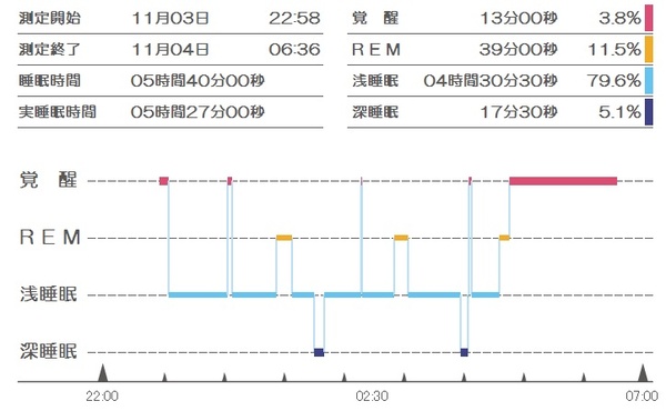その夢を、私がどんなシチュエーションで見ていたのかとても知りたかったので、自分の睡眠状態の推移を眺めてみた結果が、下に貼り付けたグラフです。