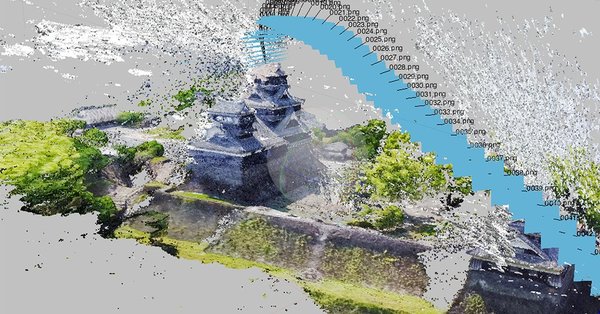 ANNnewsCHの熊本城のドローン撮影映像から、3次元点群やポリゴンを作成してみた。撮影したドローン技術屋さんが、地震後に傷ついた熊本城の姿を映し出すためにどのようなドローン軌跡を描いたのかとか、そんなことが目に見えてくるのは興味深い。