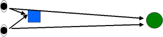 人間が立体感を感じる大きな手がかりの一つが両眼視差だ。遠くにあるものを眺める時には、右目と左目にはほぼ同じように見えるが、近くにあるものを見る時は右目と左目の場所が違うため、右目と左目では違う景色が見えることになる。例えば、下の図のように緑色の○が遠くにあって、青色の□が近くにあった場合を考えると、緑色の○は右目からも左目からも同じように見えるが、青色の□は左目からは視界の右側に見えるし、右目からは視界の左側に見える。
