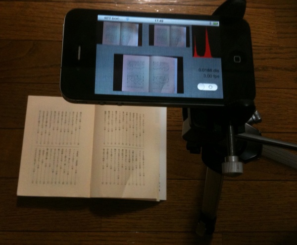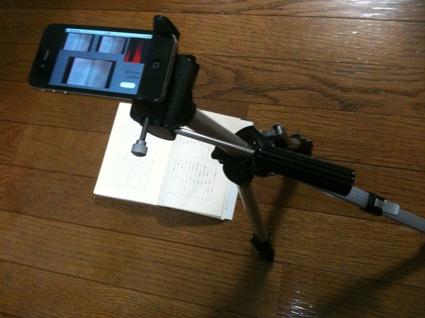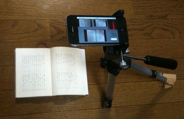 下の動画は「三脚にiPhone 4をとりつけ、文庫本の頁をめくり、電子化している」ところを写したものです。