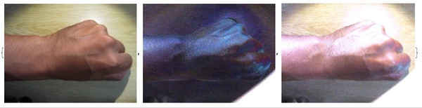もちろん、夏休みの自由工作・自由研究的には、何か「調べて見た的要素」が必要でしょうから、たとえば、この超原始的装置で撮影した動画を使って作り出した「表面反射成分を取り除いた色画像・表面反射のみ画像・表面反射を誇張した超テカリ画像」を作り出してみた結果が、下に貼り付けたものになります。表面反射における偏光具合の違いを使い、表面反射成分を取り除いています(生画像と表面反射除去後画像の例はたとえばこのような具合です)。こうした使用例とか考察とかサンプルコード付きで夏休みの自由課題・自由研究「宿題引き受け株式会社」営業中です!(ウソ)