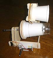 その組み立ててみた「エジソン式コップ蓄音機」が次の写真である。上の紙カップの底に針が着いていて、下の回転する透明カップの表面に紙カップの底の振動を溝として記録するのである。もちろん、再生のときはその逆である。透明カップの表面に刻まれた溝の揺れを針がなぞって、そして紙カップの底を振動させるのである。