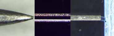 というわけで、この素晴らしい顕微鏡を使って針先を見てみたいと思う。早速、「二本の針先」を顕微鏡を使って見てみたものが次の写真である(ホントは違う顕微鏡を使った)。