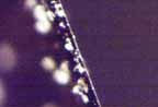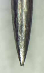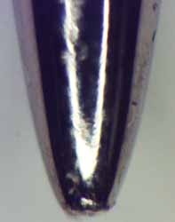さて、拝見した「エジソン式コップ蓄音機」の溝写真から判断すると、針先が痛んでいるように思えます。ちなみに、切削音はほとんどしないはず(削りかすもあまりでないはず)です。確かにこの写真には削りかすがずいぶん写っているし、ガーという切削音のノイズも凄かった。再生音に対する前回の私の感想は、普通に針先を見てもなかなか判りませんが、顕微鏡で見るとイッパツです。