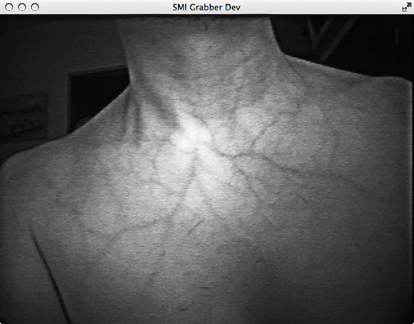 それとは逆に、可視光では見えなかったものが、赤外線で見るとイキナリ浮かび上がってきたりします。たとえば、赤外線カメラを自分に向けてみると、肉眼では全然見えない血管が、そこらかしこに浮かび上がってくるのです。ヘモグロビンが近赤外線を強く吸収するために、赤外線で眺めると、こんな不思議な姿が見えてきたりします。