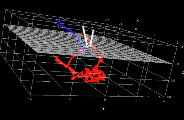 この赤い血が流れているはずの血管が(血管の無い周囲部分よりも)青く見える理由を説明するために、以前書いたモンテカルロ光計算コードで、赤色光と青色光の軌跡例を計算してみました。下の図は、上から皮膚に差し込む光があると、青色光は皮膚内で(短波長の光は散乱しやすいので)すぐに散乱して・方向を変えまくり皮膚外部へ出て行ってしまうけれど、赤色光は皮膚内奥部まで侵入してから、皮膚の内部を長くさまよってから(ようやく)皮膚外へ出ていくという計算結果を表しています。