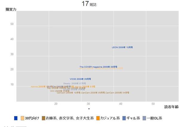 そこで、バックナンバー検索ページから「着回し」を検索した結果が着回し(右図)になります(検索回数が多いキーワードは自動的にタグとして登録されます)。その「着回し」を含む雑誌の[読者年齢 vs. 購買額]を散布図にしたものが次の右の図になります。