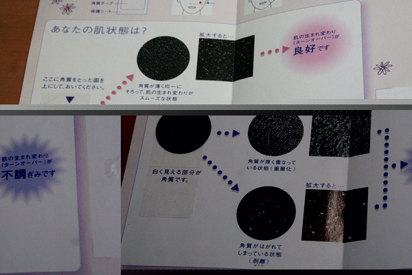 試しに、自分の頬に角質チェックテープを貼り付けて、比較用の画像と比べてみると「角質が薄く均一にそろって、肌の生まれ変わりがスムーズな状態」と「角質が厚く重なっている状態(重層化)」の中間状態、に見える。もちろん、だからといって洗顔料に気を使おうとまでは思わないけれども、こういった宣伝パンフレットは面白く感じる。