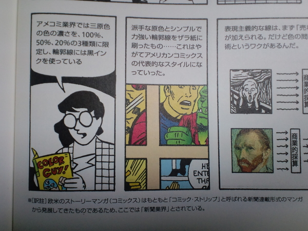 その結果として、アメコミの「派手な原色」「力強い輪郭線」と数少ない色種の組み合わせによる「識別の記号としての配色」という特徴が生まれたという。確かに、「ハルクの配色」「スパイダーマンの配色」・・・どの配色も似たような色が使われているはずなのに、「どのマンガ・どのヒーロー・どの悪役」であるかが、その配色を見れば不思議なほどにすぐわかる。