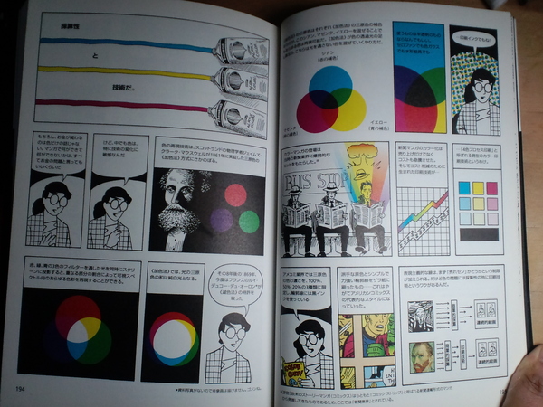 」を読んでいると、アメリカの新聞に連載されていたカラー・マンガでは、シアン・マジェンタ・イエローの3色の濃さを100,50,20パーセントの3種類に限り、輪郭線には黒線を入れていたという。新聞紙への印刷が不安定で、出力品質が決して良い状態ではなくても、色の識別がしやすいように、使う色種(インク量)を少なく限ったという。低コスト・低技術品質の中で、「わかりやすさ」を実現しようとしたわけである。