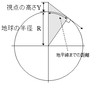 というわけで、地平線までの距離を計算してみた。まずは、そのために下図のように視点の高さYと地球の半径Rをとってやる。