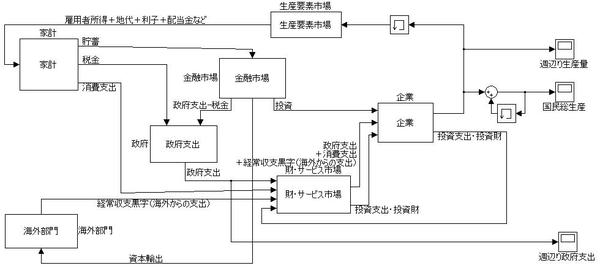 まだまだ、中谷巌 「入門マクロ経済学」のページをめくりつつ、その中にあるマクロ経済循環の図をなぞりつつ、Simulinkモデルを作っています。作っているSimulinkのmdlファイルは、ここ(今日時点での最新版はmacromodel_basic_20090307.mdl)に逐次置いてます。