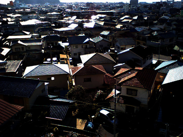丘に上がってみると、眼下の住宅街の屋根の群れが細長く光っていた。海で日没を見る時のように太陽から道が伸びて見えている。