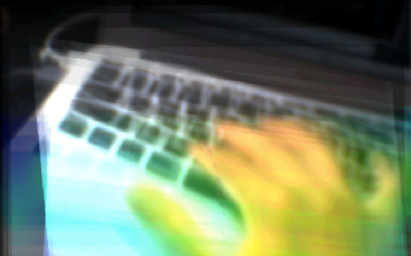 そして、サーモカメラ(遠赤外線)ではなくて、近赤外線カメラをHMDに取り付けて「近赤外線(視覚)動物」になってみると、世界はこんな感じに見えてきます。目の前にあるハッピーハッキングなキーボードは、なんとビックリ!超ハッカー仕様な無刻印モデルに変身します!(もちろん、可視光ではちゃんと文字は見えます…)