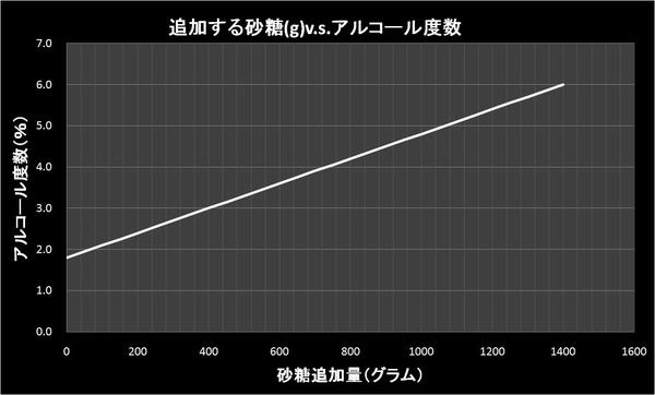 この計算してみた結果グラフを眺めると、砂糖を入れなくても、もしも完全に発酵が完了したならば、アルコール度数は1%を超えてしまう、ということになってしまう。発酵が半分程度しか進行しないような状態でなければ、アルコール度数は1%を超えてしまうのである。