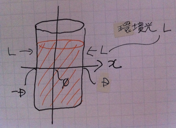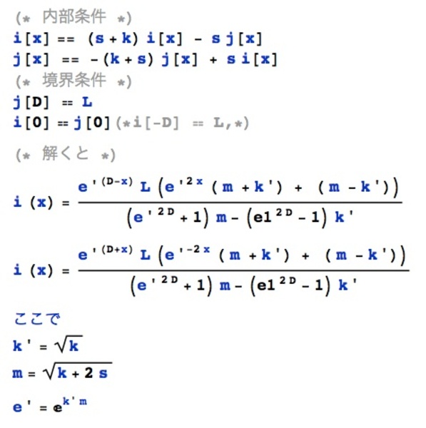この連立微分方程式は(連立微分方程式とはいっても)i(x)とj(x)は原点対称の「実は同じもの」ですから、結局のところ、普通の微分方程式です。そうした媒質内部の現象を書いた微分方程式に、ビールグラス境界で「外部からの環境光 L が入ってくる」という境界条件を付けて(あるいは、対称性から原点でi(x)とj(x)が等しいといった境界条件を付けて)、微分方程式を解いてやると、上に書いたようなi(x)とj(x)を表す式が導かれます。