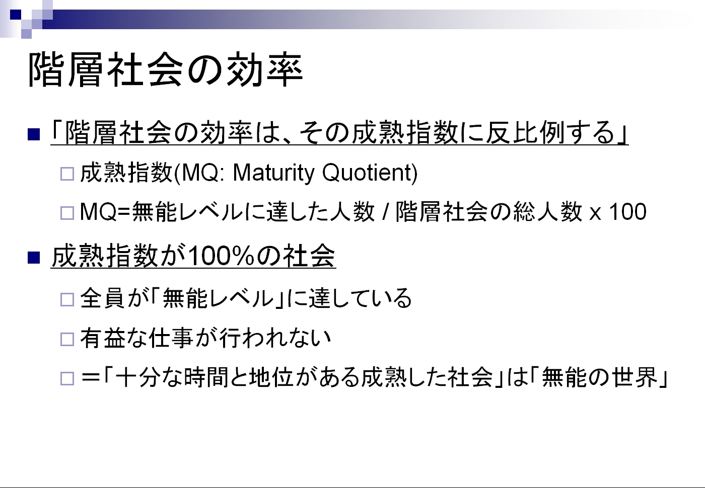 『ピーターの法則とは,「人々は自らが無能になるレベルにまで昇進する」という社会現象を扱った概念だ。階層構造を持つ組織において,人々は自らの能力を発揮できる階層に居る間は昇進を続け,能力を発揮できない階層に達すると昇進が止まってしまう。かくして,組織の内部は無能な人々ばかりで埋め尽くされてしまうことになる』 また、『階層社会のすべてのポストは、その責任を全うしえない人々によって占められるようになると同時に、仕事はまだ無能のレベルに達していない人々によって遂行される』