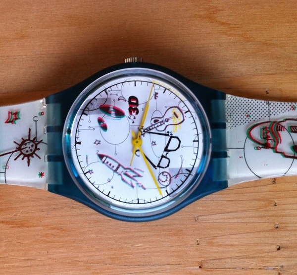 バザーでSWATCHの"3D"腕時計があったので、500円で買いました。新品らしき、けれど電池は切れているという状態でしたが、赤と青の2色で描かれた"3D"という言葉に惹かれ買ってしまいました。