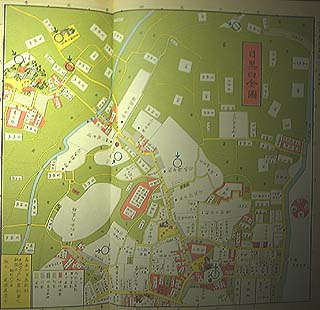 目黒白金図 (1858)による、目黒不動の部分。内部の位置関係はそれほど変わっていなかった。内部に入ると龍泉寺という名前が納得できるだろう。 また、「虚無への供物」が好きな方ならば、いきなりコンガラ童子達が出現するのには驚くはずだ。 1858年といってもたかだか150年前である。江戸時代の圧倒的な長さから比べたらごく最近である。 | ![]() |