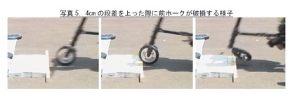 65kgのダミー人形を乗せ、時速15kmで4cmの段差を上がったところ、樹脂製(ナイロン)の前ホークが根元で破損した。