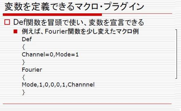 マクロ関数やネイティブ・プラグインを組み合わせれば、さらにカスタムプラグインを作ることもできます。また変数を使ったり演算や数式処理も使えて、NEWやDELETEといったマクロを使い、局所領域に対してだけ演算を行うこともできます。そして、マクロプラグインには自動的にGUIをかぶせることもできるのです(GUIコードを書かなくても、ダイアログで変数設定などを実行時にすることができる)。