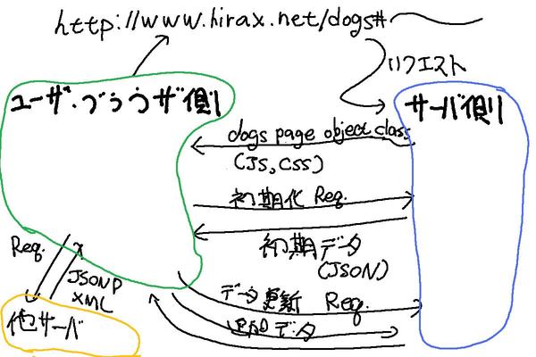 「ページオブジェクト指向プログラミング」というのはどういうものかといえば、最初に「クライアント側へページをつかさどるJavaScriptのクラスソースを送りつけ」「インスタンスを作成」したあとは、勝手にクライアント側で「初期化をしたり」「初期・逐次データを集めたり」「データ書き換えをしたり」といった作業を適当にしてくれる、というスタイルである。サーバー側はデータベース操作の仲介役と、数種のページオブジェクトをクライアントに送信するだけ、という役割だ。