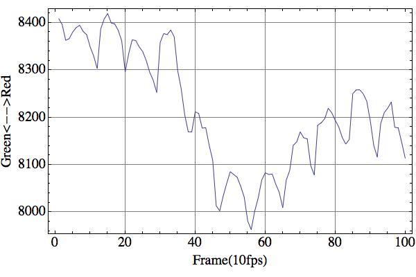 …なるほど、これが脈拍を反映した肌の色変化なのかもしれません。今この時点のわたしの脈拍は70(回/分)程度のようです(点滅を高速に繰り返す照明周期と撮影周期のビートが生じていないか?という点は気にかかりますが)。