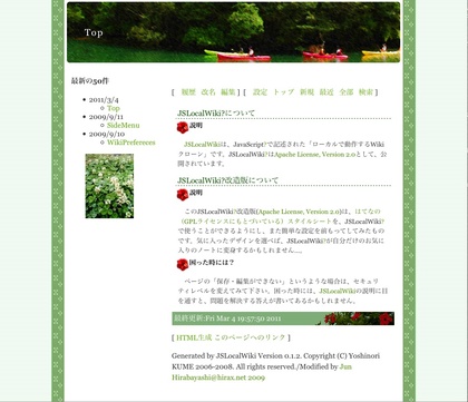 JavaScriptで書かれたWikiシステム、ブラウザさえあれば(ローカル・コンピュータの上で)何も考えずに動いてくれる"JSLocalWiki"を「はてなスタイルシート」を使うことができるようにしたものを愛用しています。何も難しいことを考える必要もなく、Wiki が入っているフォルダを「コピーして持ち歩く」だけで、どこでもWikiを読み書きすることができるので、とても重宝しています。